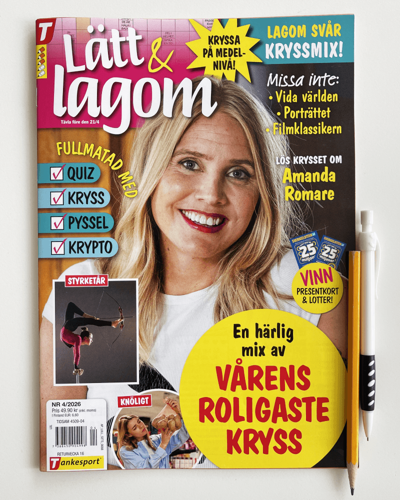 Om du älskar korsord är Lätt och Lagom tidningen för dig. Här finns en stor blandning på kryss och svårighetsgrader – från lätta till medelsvåra. Målsättningen är att du som läsare ska kunna klura ut alla ledtrådar själv utan att behöva plocka fram en uppslagsbok, ordbok eller korsordsbok. Svårighetsgraden ligger på tre av fem pennor enligt Tankesports skala.