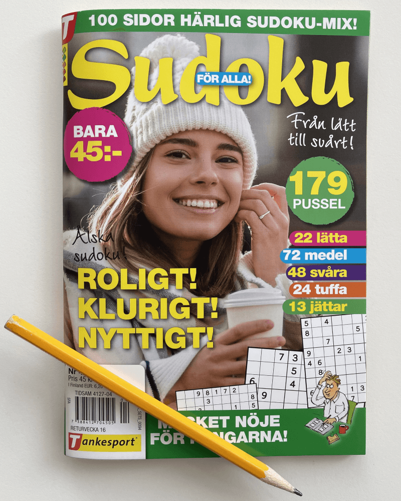 Låter detta klurigt och kul? Då är du inte ensam. Sudoku är omåttligt populärt och tidningen Sudoku för alla är en av de största tidningarna i sin genre i Sverige. I varje nummer får du 100 sidor av sudoku, från lätta till riktigt svåra. Längst bak i samma tidning hittar du alla lösningar.